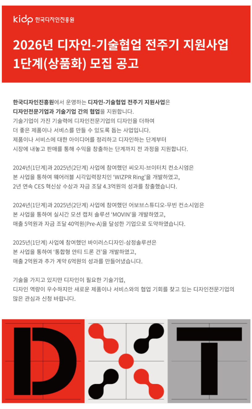 「2026년 디자인-기술협업 전주기 지원 1단계(상품화)」 모집 공고를 안내드립니다.